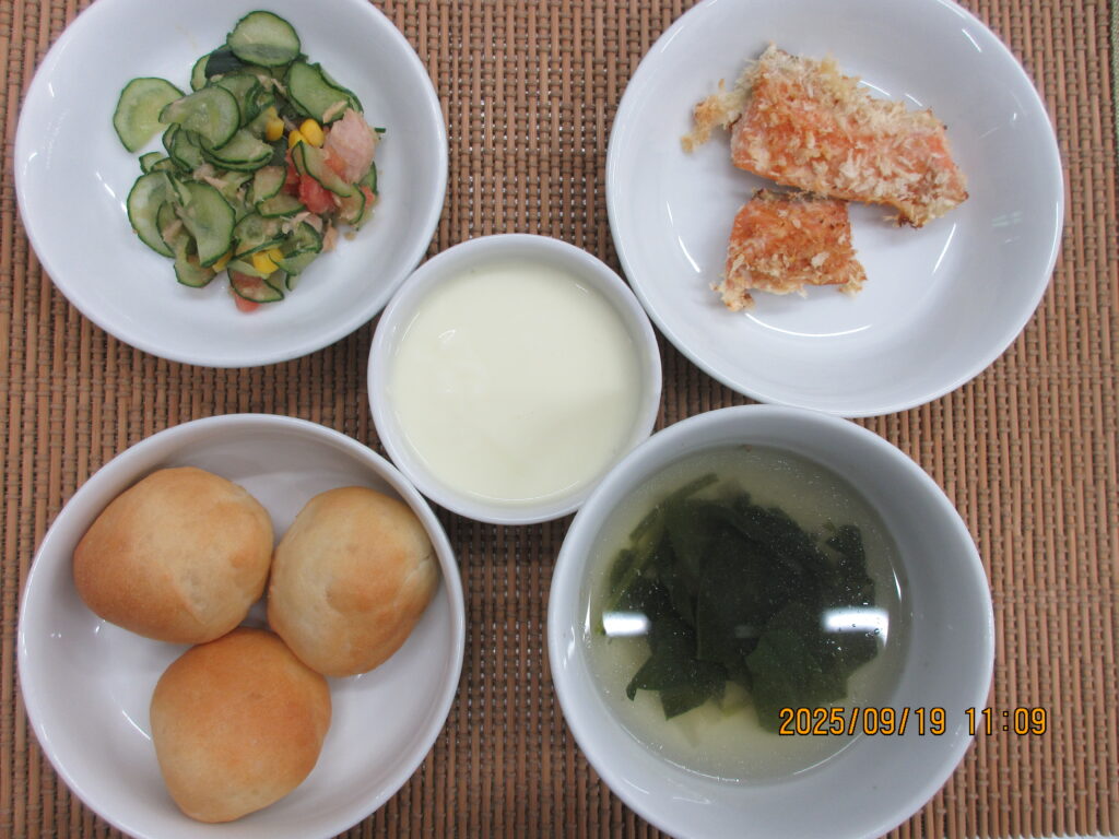 [給食:プレーンパン、スープ、鮭のタンドリー焼き、サラダ、ヨーグルト]