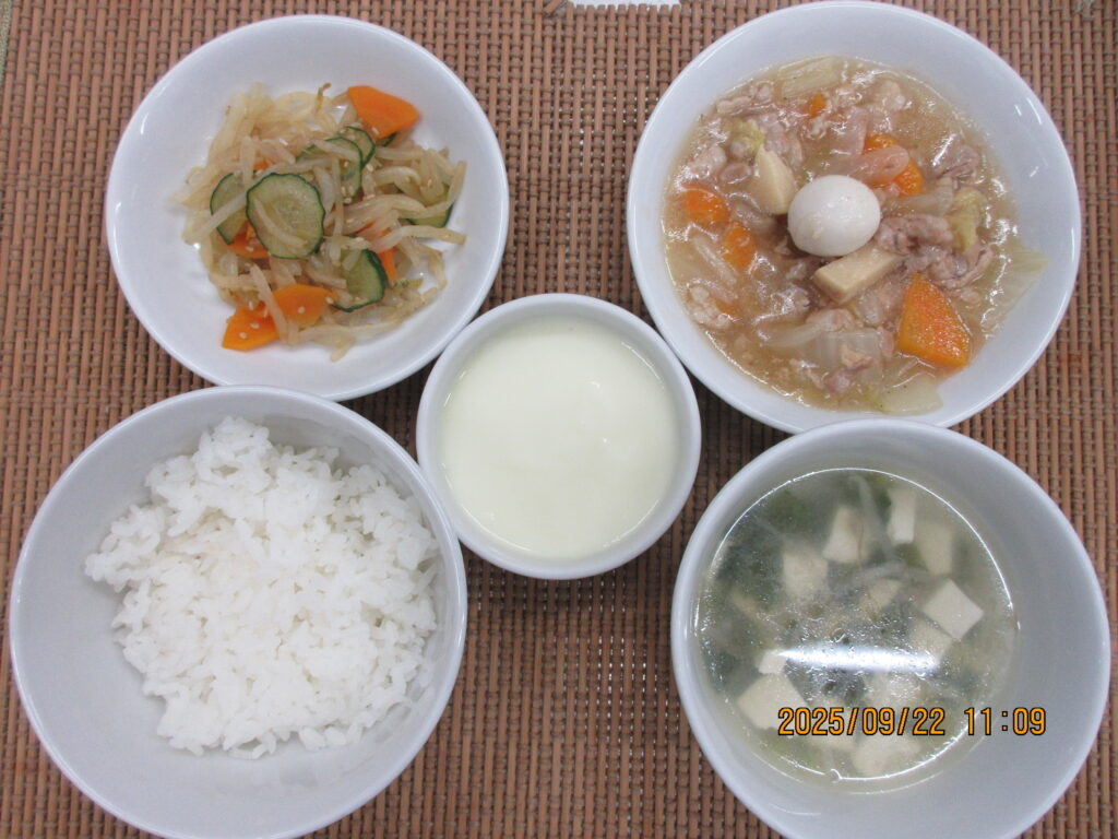 [給食:白米、スープ、八宝菜、ナムル、ヨーグルト]