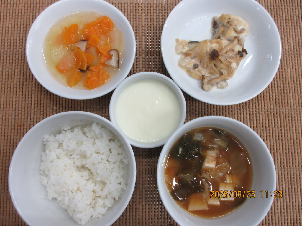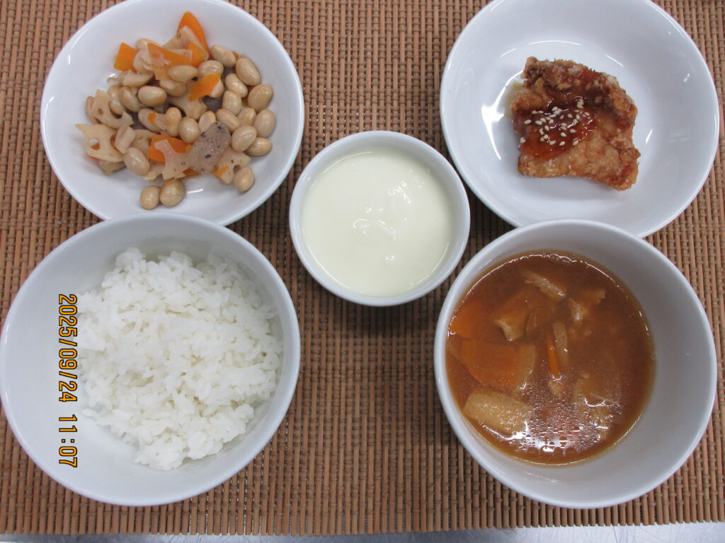 [給食:白米、豚汁、鶏の照りかけ、五目煮、ヨーグルト]