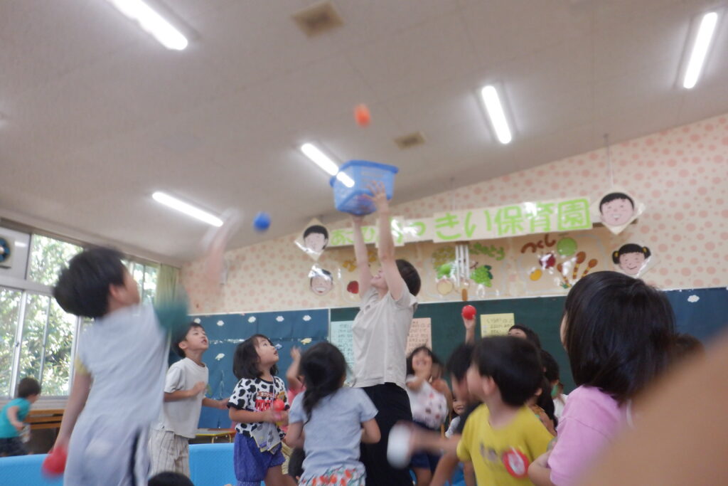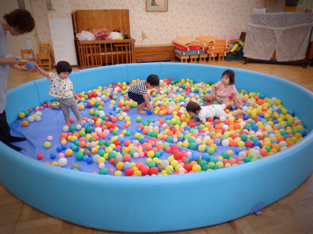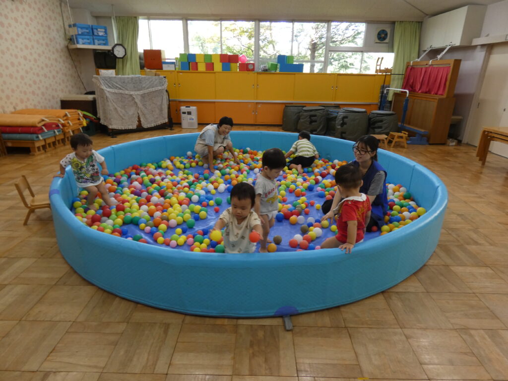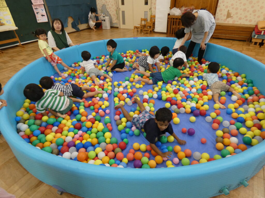 朝から楽しみにしていた子が多くいた幼児組の子どもたち。「きょう、ぼーるぷーるだって!」「ぼーるぷーるだよね」とウキウキとした声が聞こえてきました。大喜びでプールの中に入ると、仲間と一緒にボール入れをして楽しみました。
