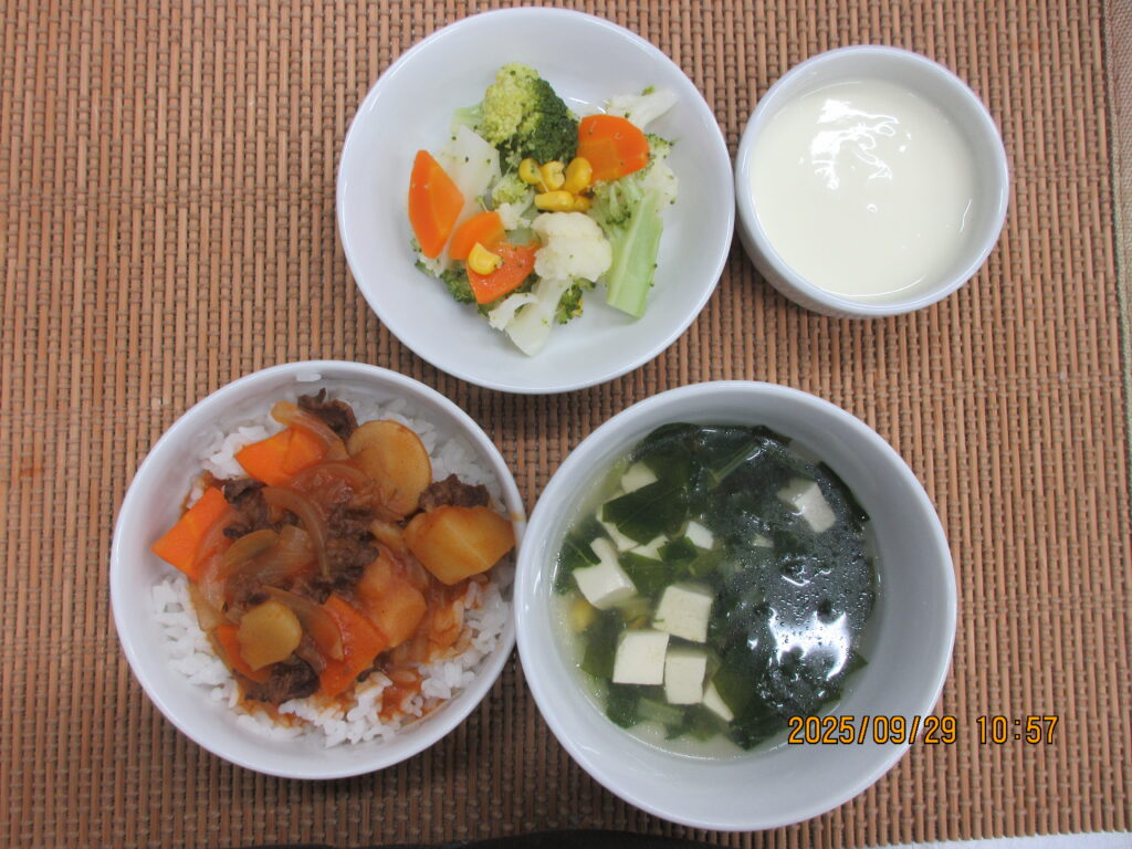 お昼 【ハヤシライス ドレッシングサラダ スープ ヨーグルト】