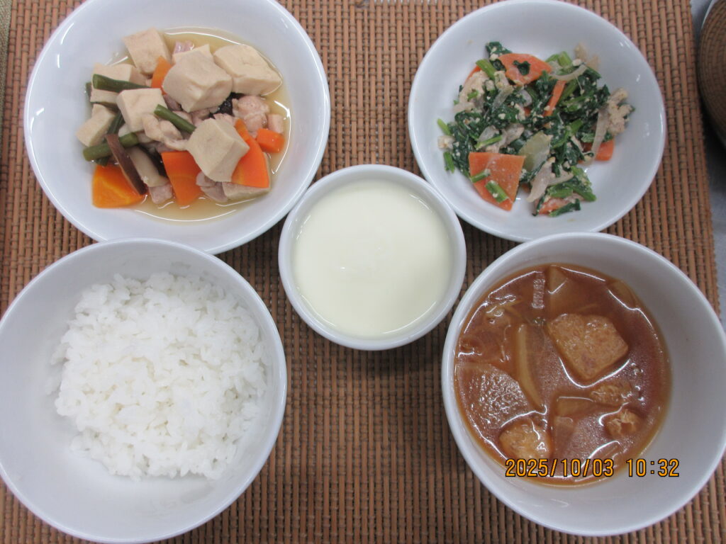 昼【ご飯、高野豆腐の含め煮、くるみ和え、味噌汁、ヨーグルト】