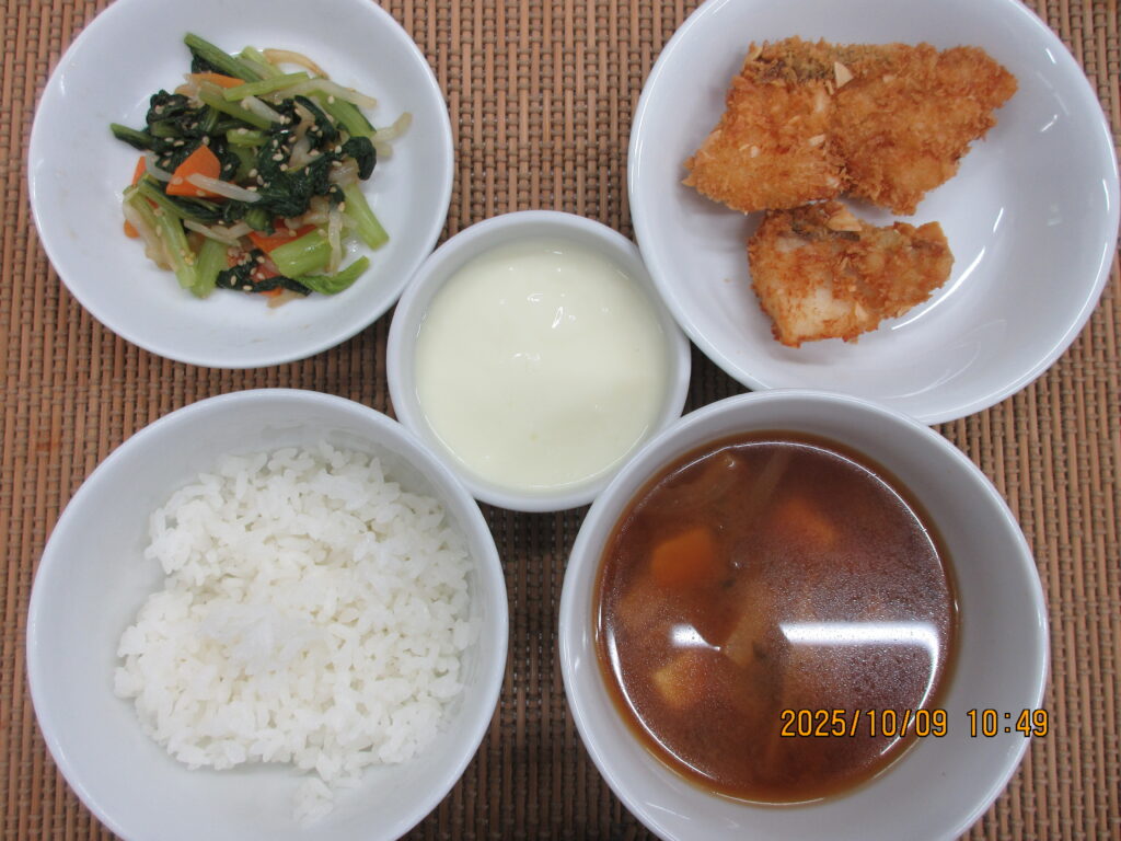 【昼】米飯 鱈のアーモンドフライ 小松菜のごま和え 味噌汁 ヨーグルト
