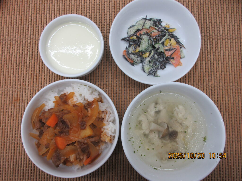 昼【ハヤシライス、ひじきのマヨネーズサラダ、スープ、ヨーグルト】