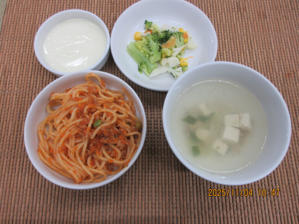 5日昼【ミートスパゲティ、ブロッコリーサラダ、スープ、ヨーグルト】