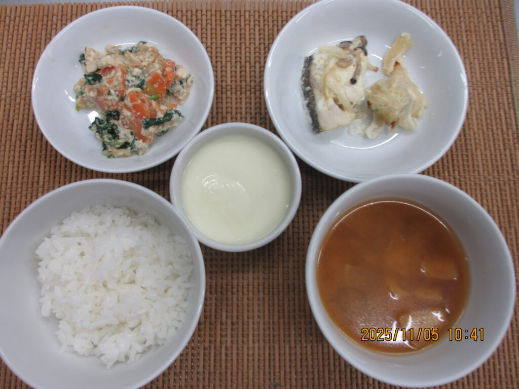 6日昼【ご飯、鱈のマヨネーズ焼き、白和え、味噌汁、ヨーグルト】