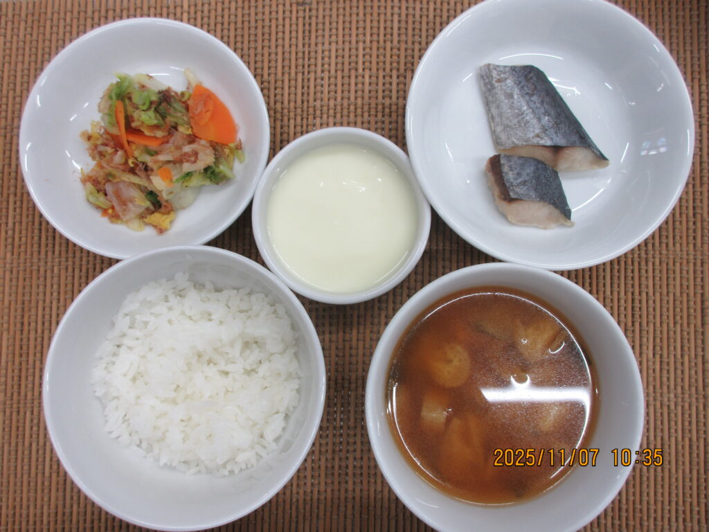 昼【ご飯、鰆の塩焼き、白菜のおかか和え、味噌汁、ヨーグルト】
