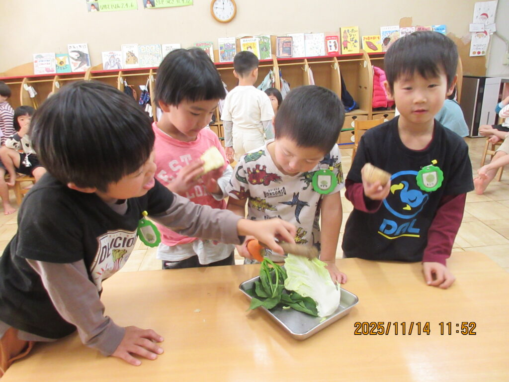 今日は子どもたちに、旬の食材であるほうれん草、人参、白菜、ごぼう、さつまいも、れんこんを触ってもらいました。