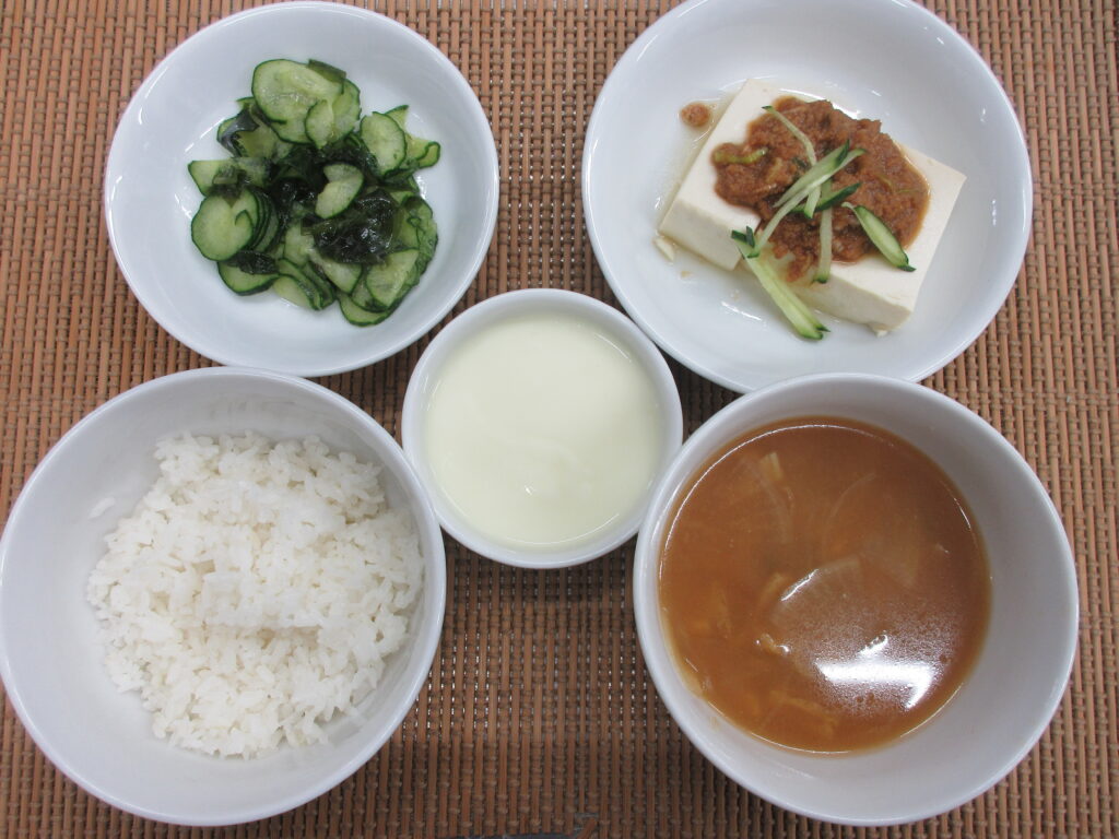 昼【米飯、豆腐の肉味噌がけ、胡瓜とわかめの三杯酢、味噌汁、ヨーグルト】