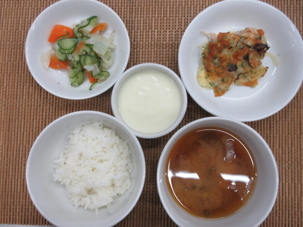 昼【米飯、鶏肉のチーズ焼き、かぶの浅漬け、味噌汁、ヨーグルト】