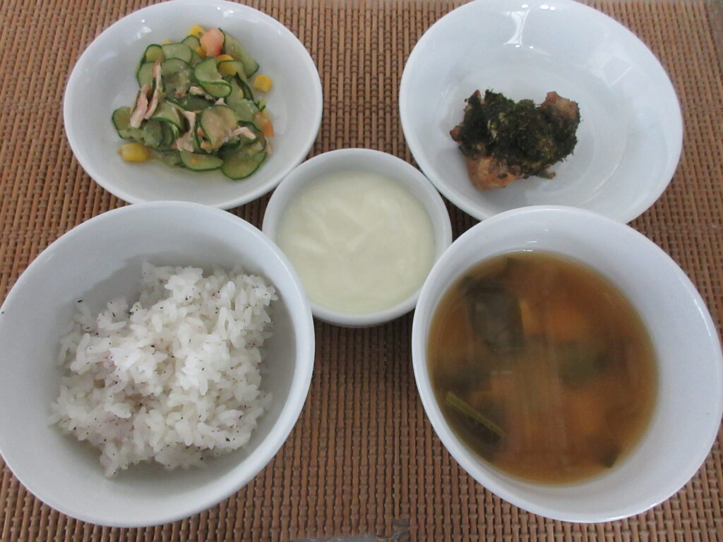 昼【ゆかりご飯、鶏の香草焼き、胡瓜の中華和え、味噌汁、ヨーグルト】