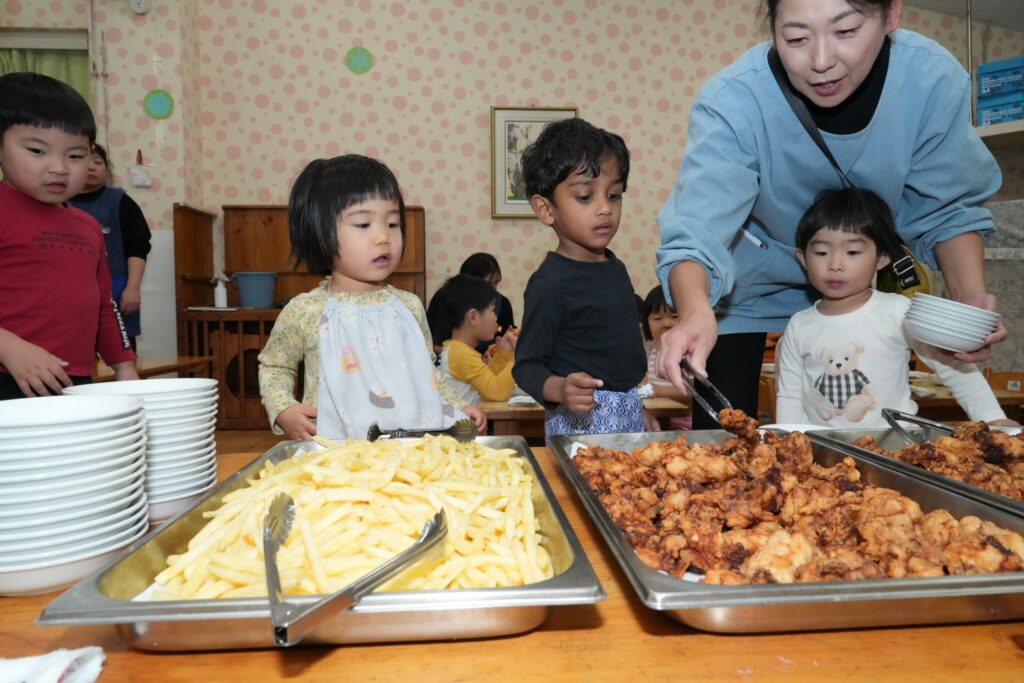 2~5歳児の子どもたちは、ホールで会食です。食べたいものを選んで食べています。