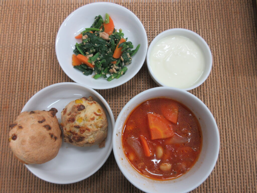 昼【コーンパン、ほうれん草のツナサラダ、ミネストローネ、ヨーグルト】