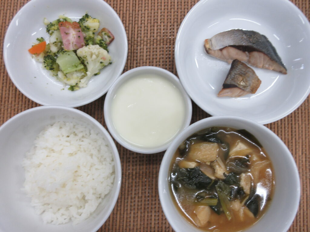 昼【米飯、鰺の塩焼き、ドレッシングサラダ、具たくさん味噌汁、ヨーグルト】