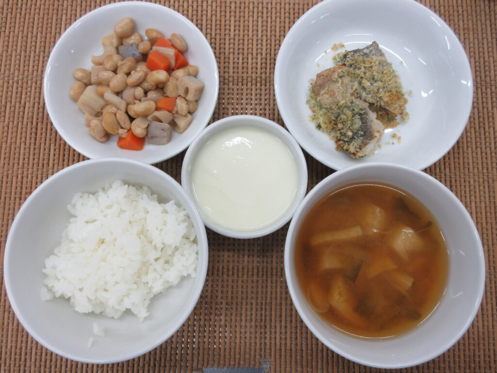 昼【米飯、鱈のパン粉焼き、五目大豆、味噌汁、ヨーグルト】