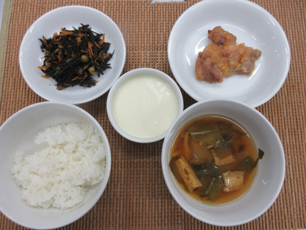 昼【米飯、鶏肉のマーマレード焼き、ひじきの煮物、味噌汁、ヨーグルト】