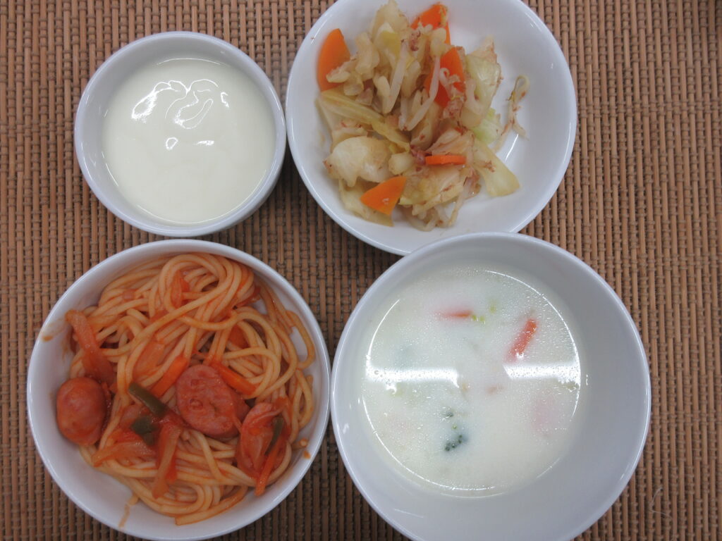 お昼【ナポリタンスパゲティ キャベツのおかか和え スープ ヨーグルト】