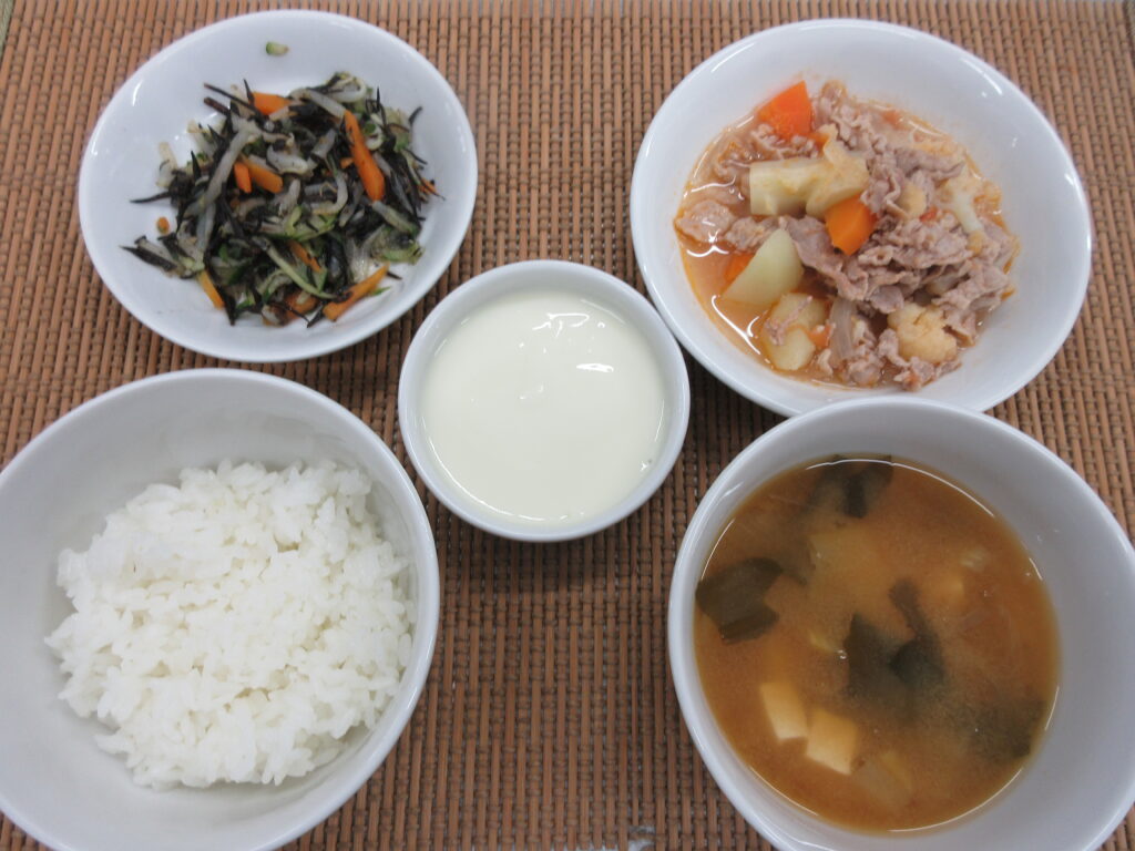 昼【米飯、豚肉と野菜のトマト煮、ひじきのナムル、味噌汁、ヨーグルト】