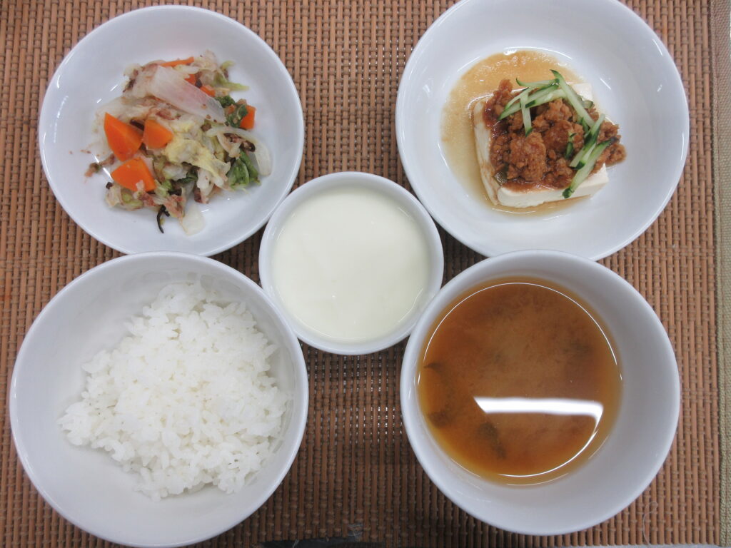 昼【米飯、豆腐の肉味噌がけ、白菜の和え物、味噌汁、ヨーグルト】