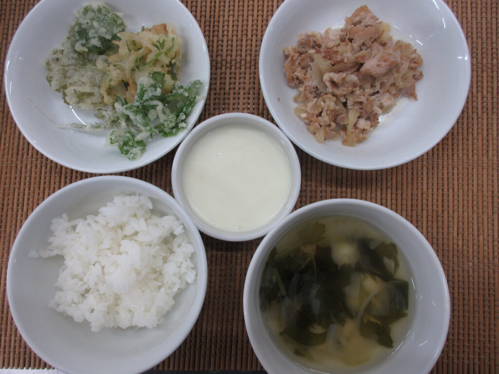 昼【米飯、豚の生姜焼き、山野草の会、すまし汁、ヨーグルト】