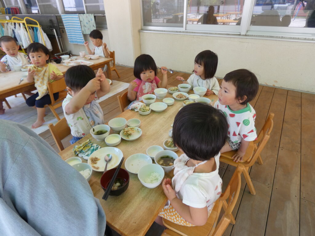 今日は山野草の会でした。つくし組(幼児クラス)の子どもたちが採ってきた山野草を、外でてんぷらにして皆で食べました。