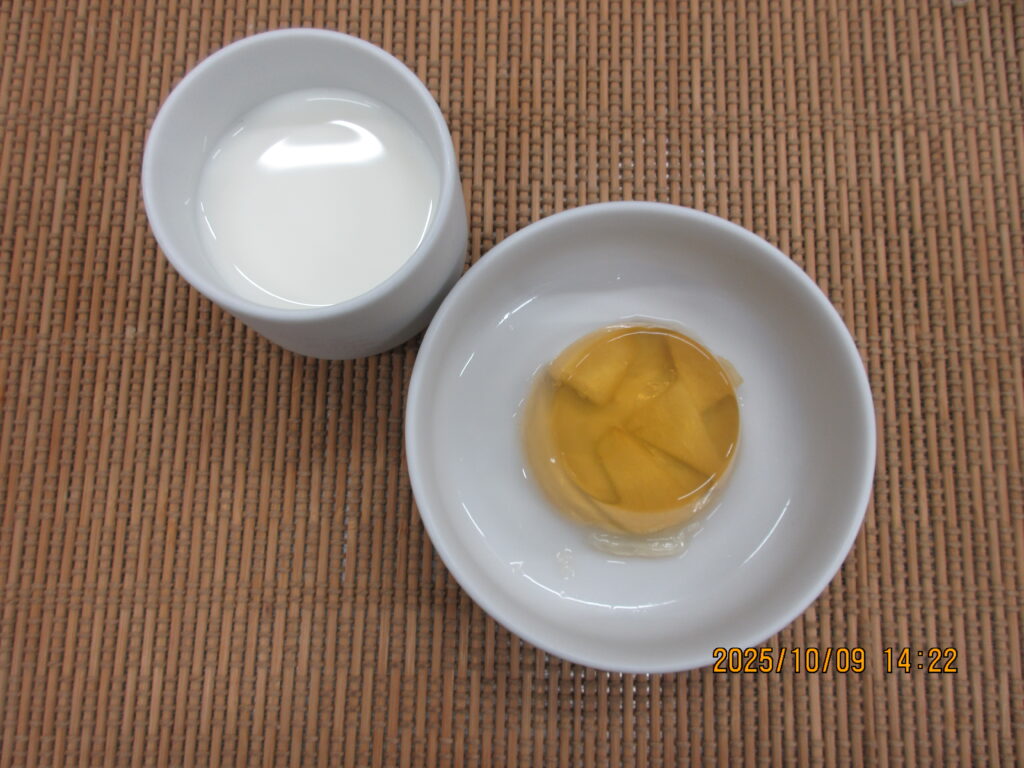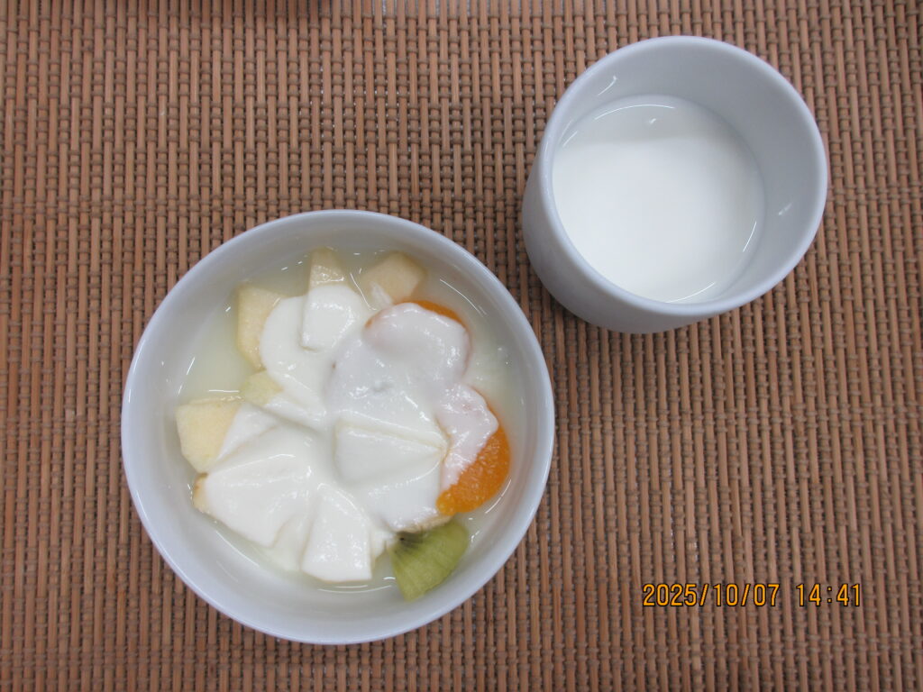 【昼】米飯 鱈のアーモンドフライ 小松菜のごま和え 味噌汁 ヨーグルト 味噌汁には崩れにくい木綿豆腐を使用しています。先日マーボー丼に絹ごし豆腐を使ったので、食感の違いに気付く子どももいました。 【おやつ】りんごゼリー 牛乳 りんごゼリーは... -