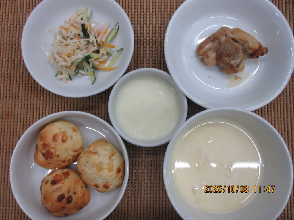 昼【チーズパン、ローストチキン、切り干し大根のコールスローサラダ、コーンスープ、ヨーグルト】 パンはいつも手作りです。焼きあがる頃に香ばしい匂いに誘われて、子どもたちが厨房を見に来ていました。 おやつ【鮭おにぎり、牛乳】 今が旬の鮭を焼いて... -
