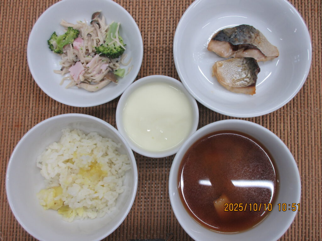 昼【さつまいもご飯、鯖の塩焼き、きのこのサラダ、味噌汁、ヨーグルト】 今日は旬の日なので、子どもたちに食材に触れてもらいました。さつまいもの匂いや感触を好む子どもが多く、それを使ったさつまいもご飯も喜んで食べていました。 おやつ【人参ケー... -