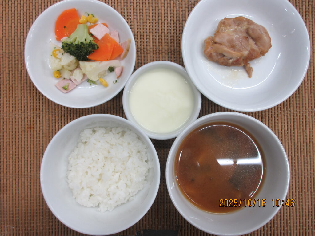 昼【米飯、鶏の漬け焼き、ブロッコリーサラダ、味噌汁、ヨーグルト】 ブロッコリーサラダに使っているドレッシングは、酢、砂糖、油、塩で作っています。シンプルな味わいに甘いコーンとハムの塩気がアクセントになっています。 おやつ【野菜チップス、牛... -