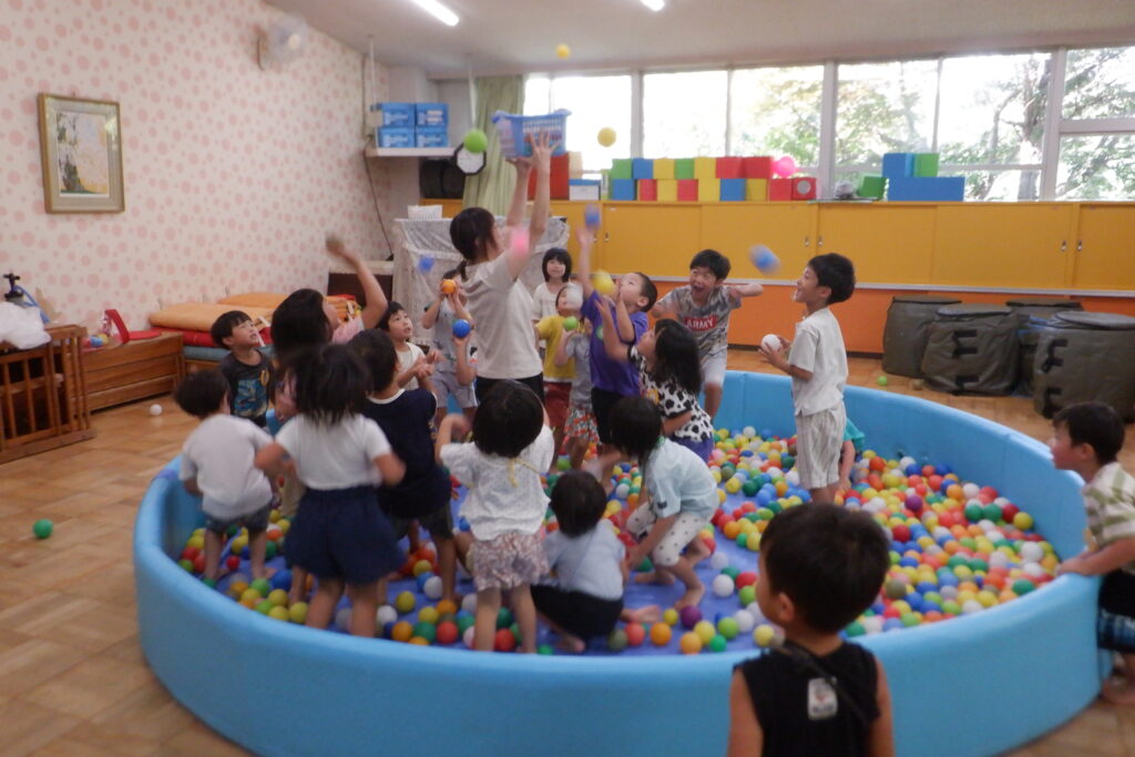 ボールプールであそびました。大きなプールに入っている沢山のボールを見て、すぐさまプールに入っていく子どもたち。同じ色を集めたり、投げてみたりとどの子も楽しそうでした。 朝から楽しみにしていた子が多くいた幼児組の子どもたち。「きょう、ぼ... -