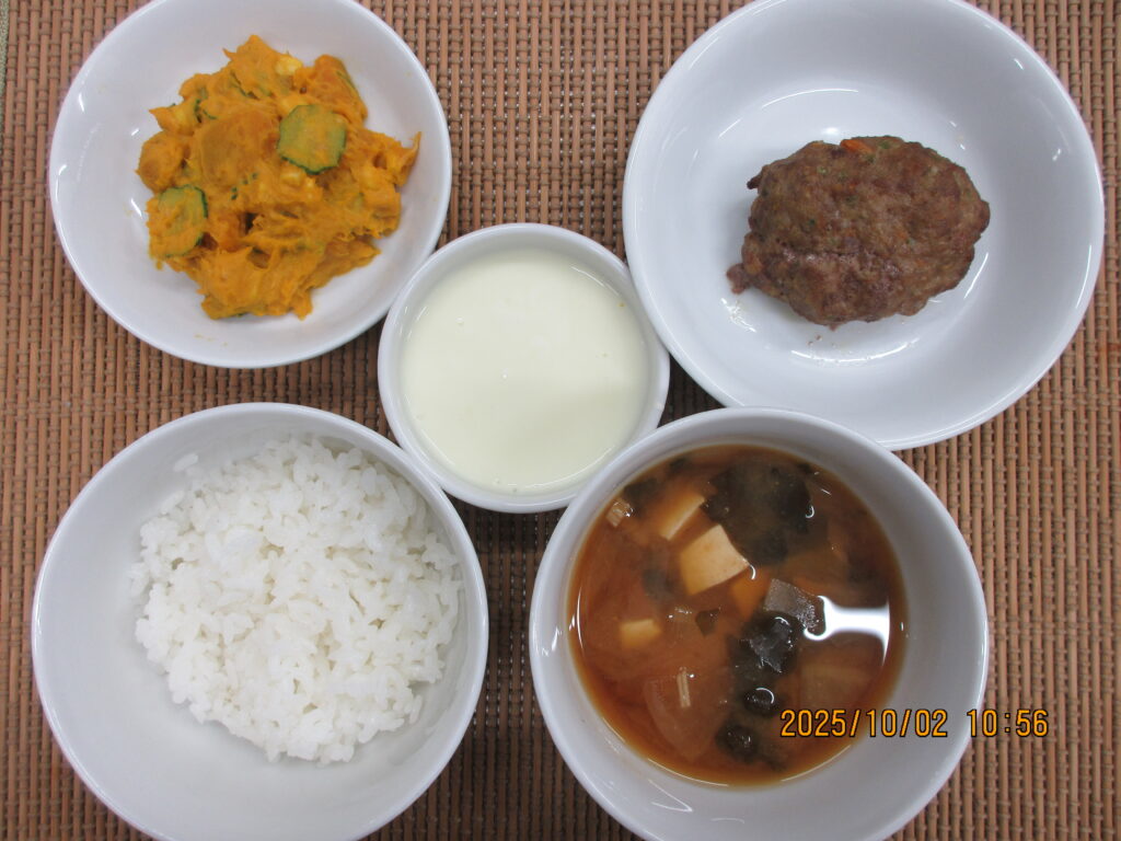 昼【ご飯、ハンバーグ、南瓜サラダ、みそ汁、ヨーグルト】 南瓜サラダを食べた子どもたちは、舌が黄色くなることを楽しんでいました。南瓜は風邪予防にぴったりの野菜なので、子どもたちにたくさん食べてほしくてメニューに取り入れています。 おやつ【プ... -